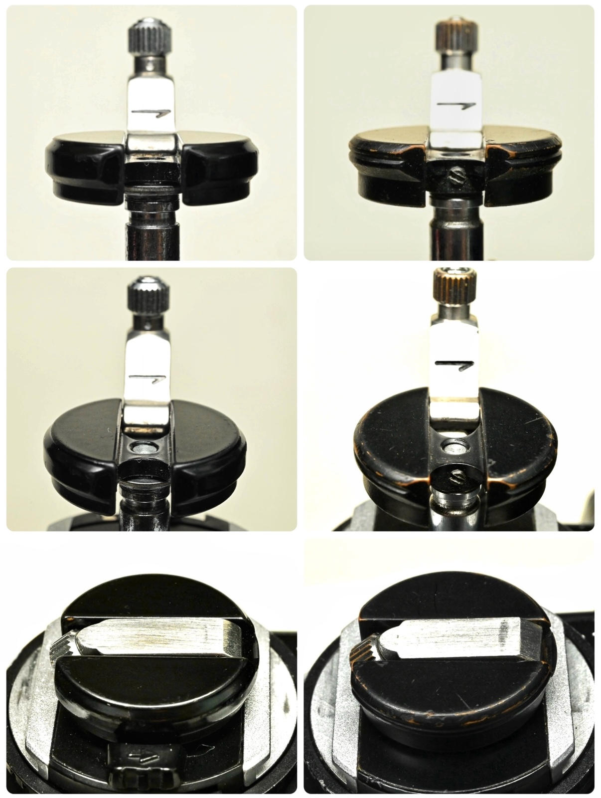 裏ぶたロックレバーの廃止に伴い巻き戻しノブを引き上げるのが通常の個体と比べて固くなっているため、つまみやすいよう巻き戻しノブの形状が変更になっています。画像は、左側が通常のF3、右側がF3Pです。