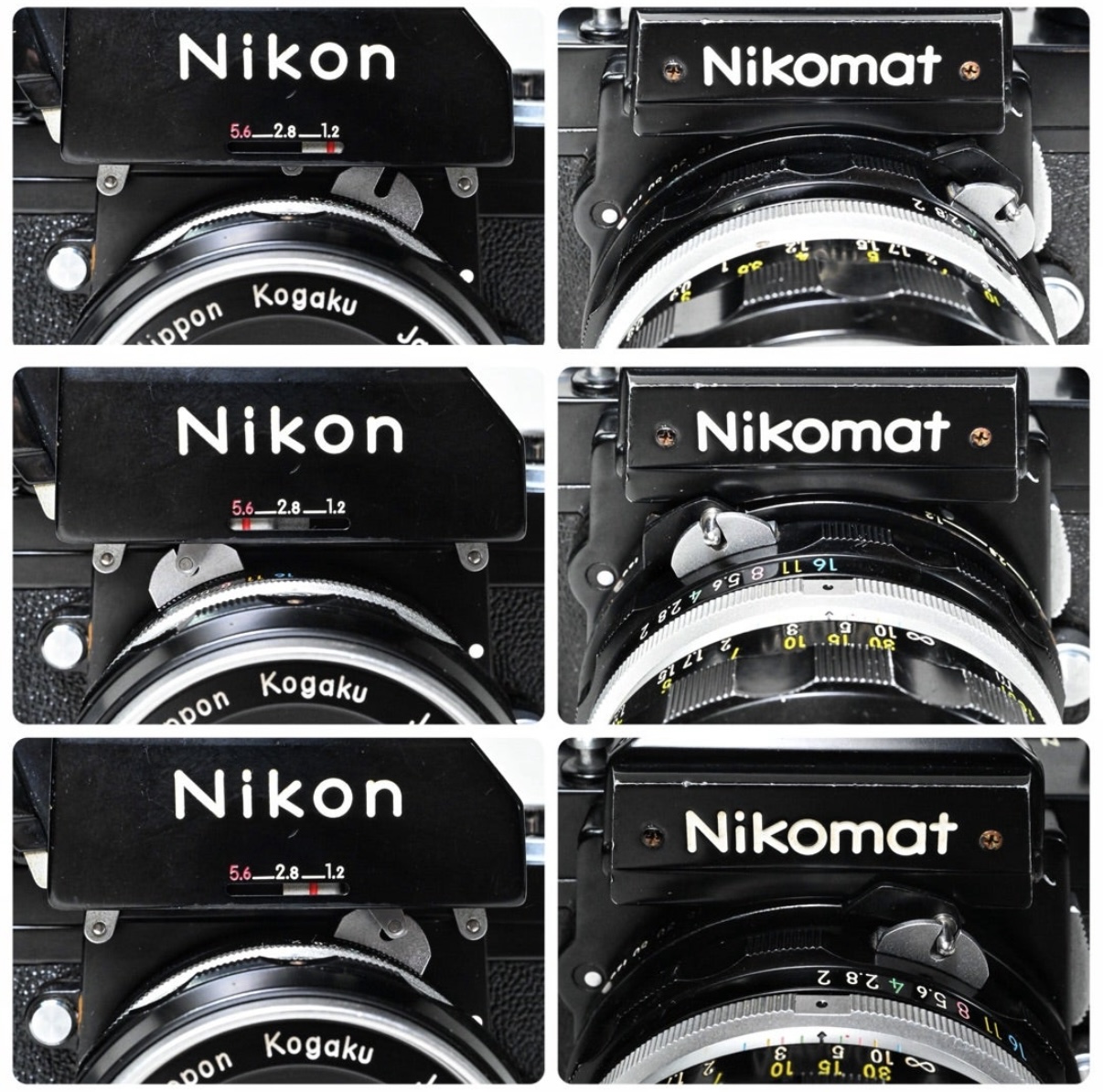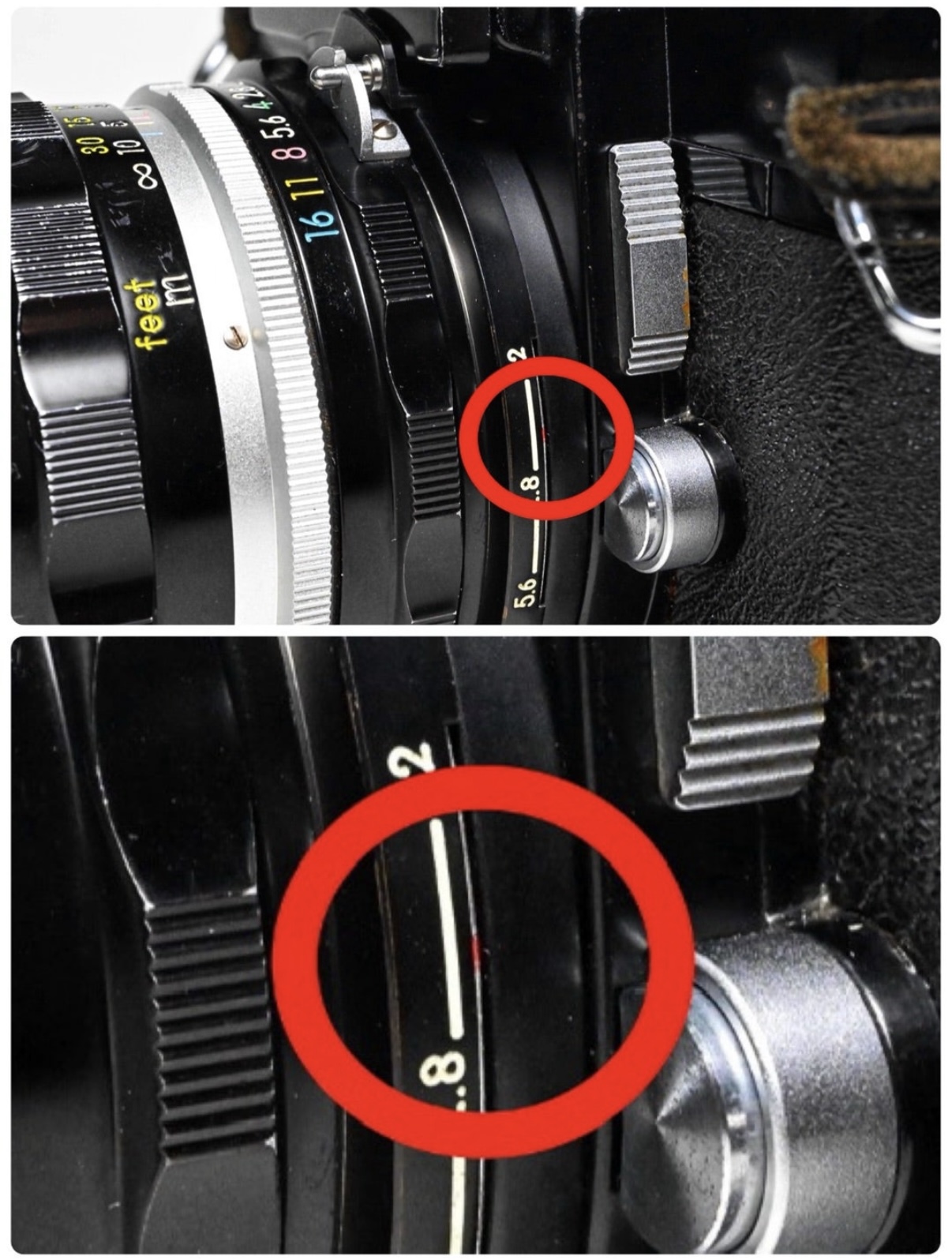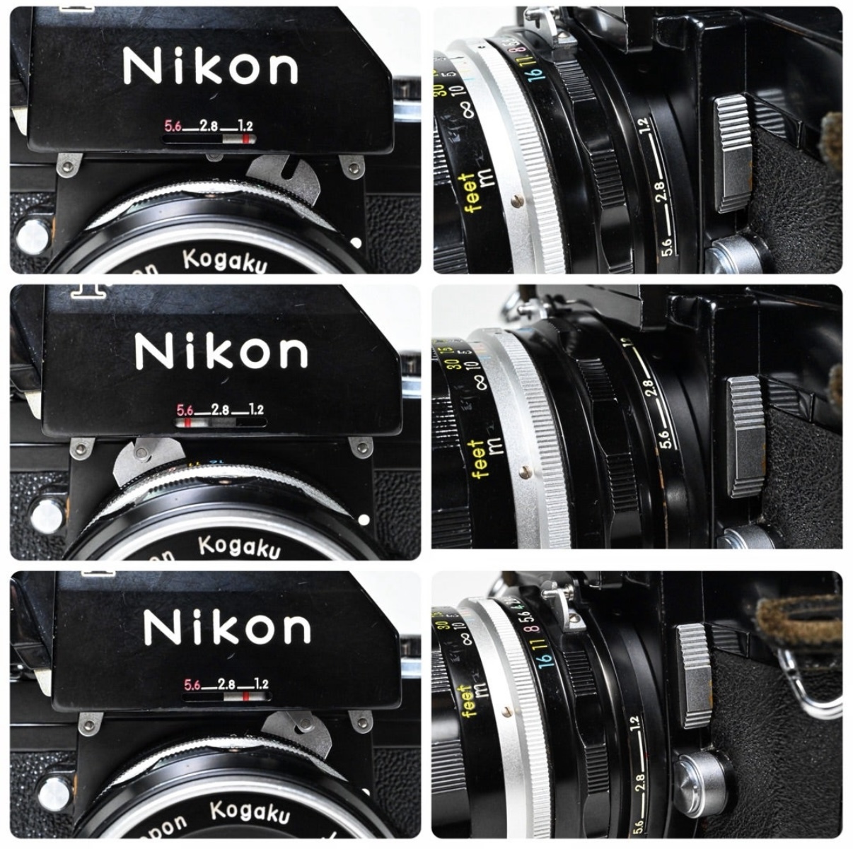 左側のフォトミックFTNファインダーは、「Nikon」の刻印の下にある「開放Fナンバー目盛」が、上段は最小数値を指していますが、中段ではガチャ1をしたので露出計連動レバーがカニ爪と噛み合ってその時のF値(この時はF5.6)を指しています。そして、下段ではガチャ2をしたので「開放Fナンバー目盛」がこのレンズの解放F値であるF2を指して、無事伝達終了となっています。