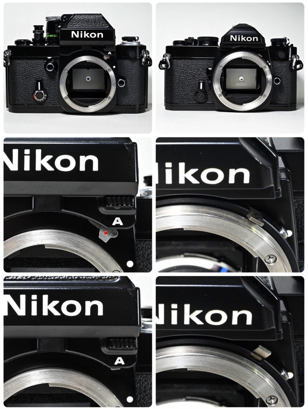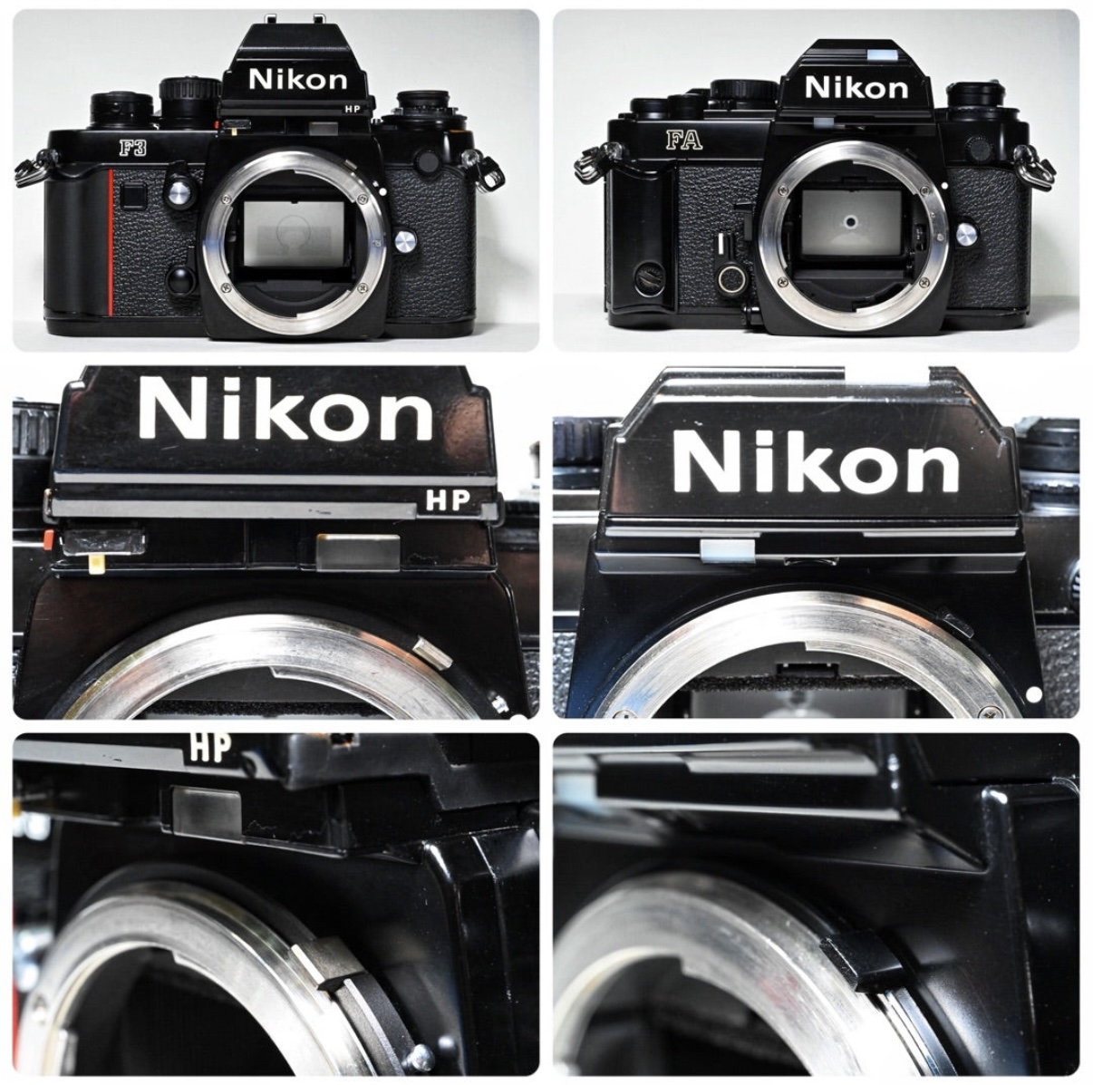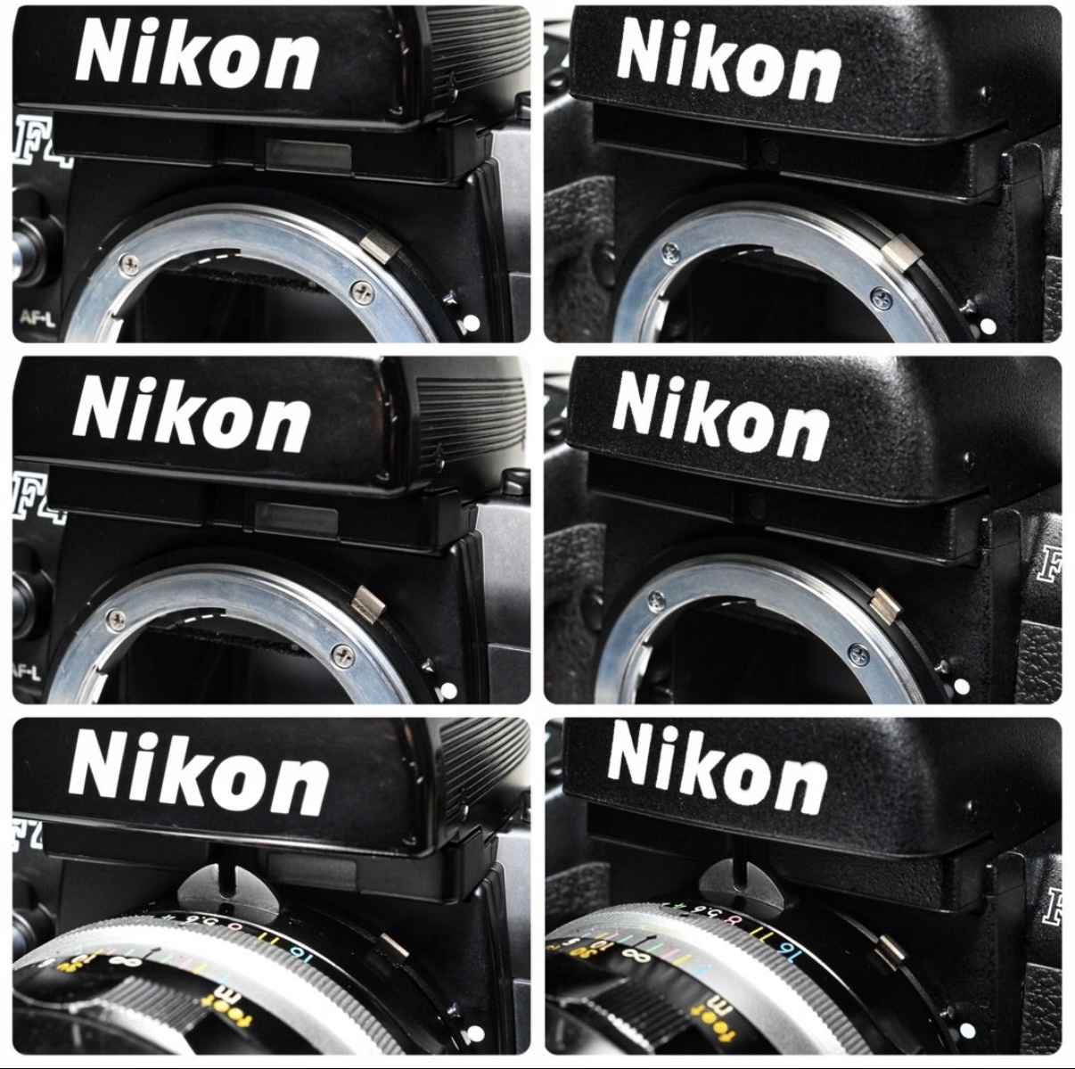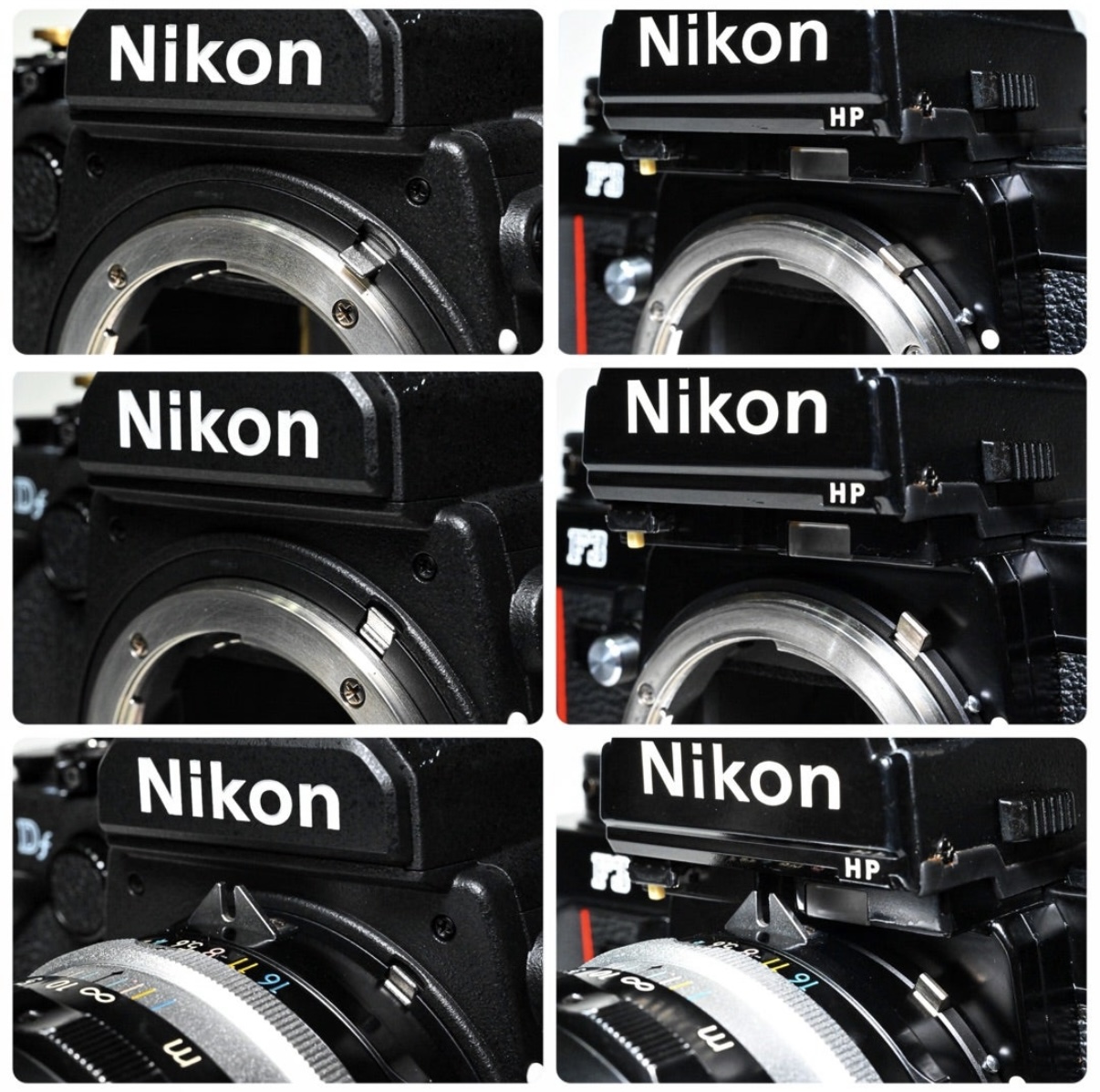 ①代表のF3と②代表のFAを比較してみます。露出計連動レバーが金属製でそれを跳ね上げる時にロック解除するピンの有無ですぐにわかりますね。②のボディーはAi前のレンズを取り付けようとしても、露出計連動レバーが干渉するので取り付けられません。無理にすれば付かない事もないのですが、破損の恐れ大なので絶対おすすめしません。