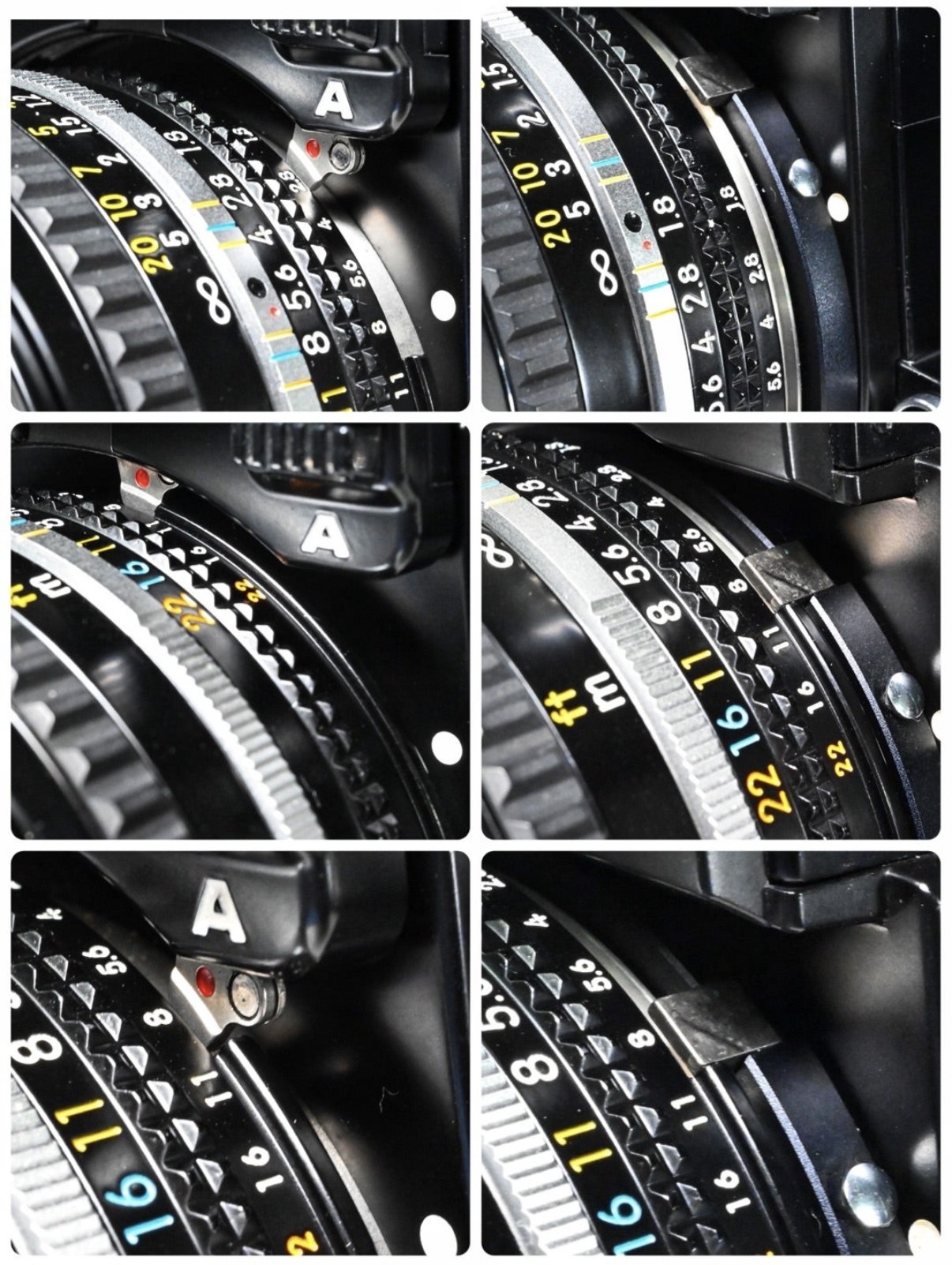 上段の画像のとおり、左側のAi前はカニ爪に穴がなく、右側のAiにはカニ爪に穴が空いています。これは、中段の画像でわかるように、カニ爪の裏側にも追加で刻印されている絞り値に光を当てるためだと思われます。